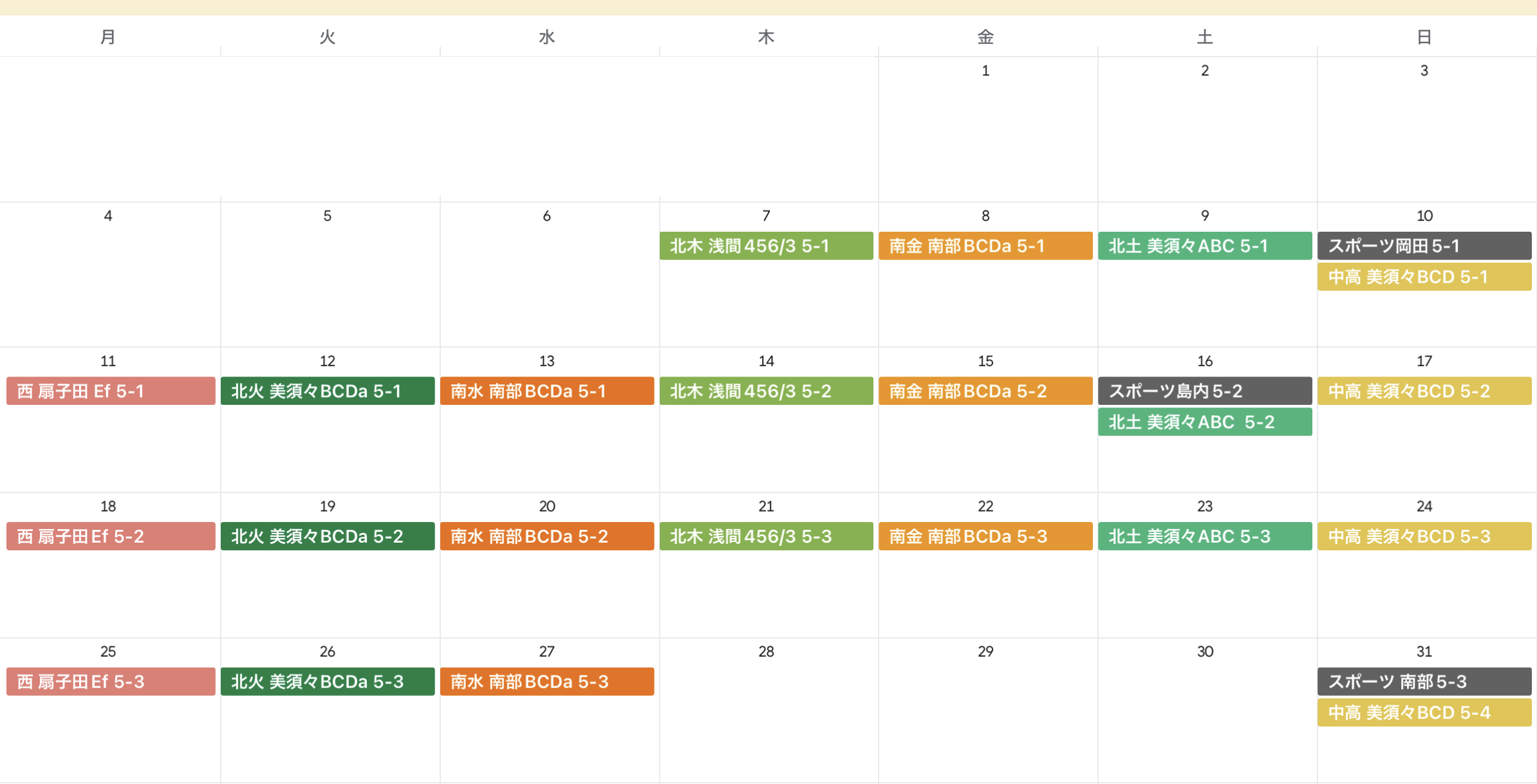 レッスン予定表 2026.4月 ※木曜クラスの日程が変更になりました。(4/1更新) 2026.5月 (4/11掲載) ★テニス教室 日程・会場 松本西校(月) 松本北校(火・木・土) 松本南校(水・金) 中高生クラス ★多種スポーツ教室 日程・会場 多種スポーツ教室